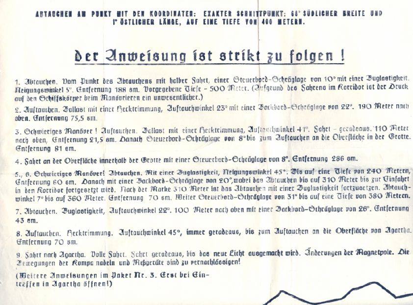 A térképen található egy víz alatti utat ábrázoló metszet, amely utasításokat tartalmaz arra vonatkozóan, hogyan lehet eljutni tengeralattjáróval a belső világba.